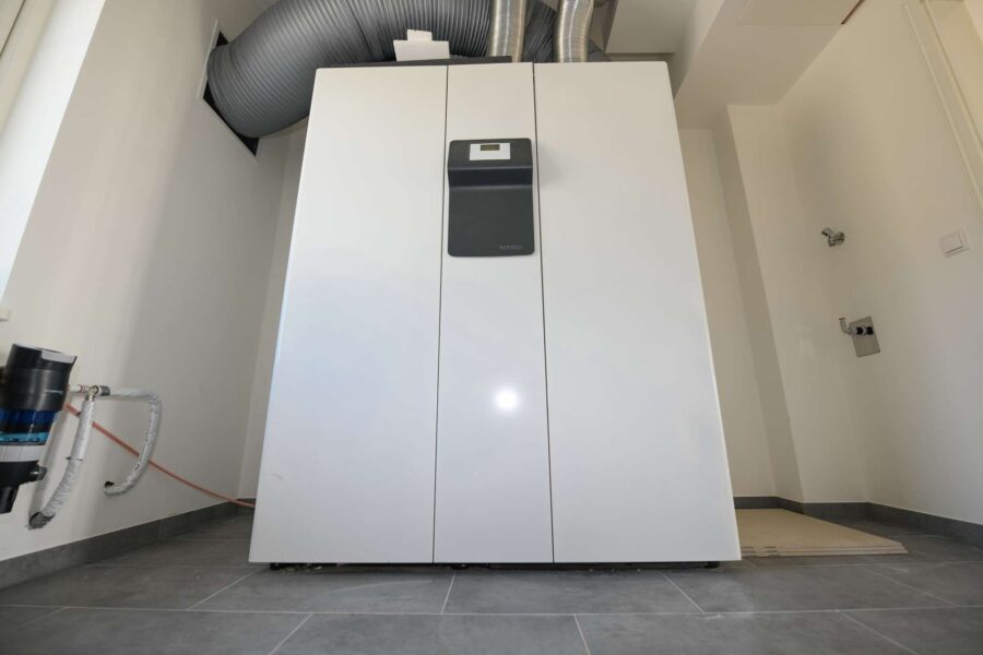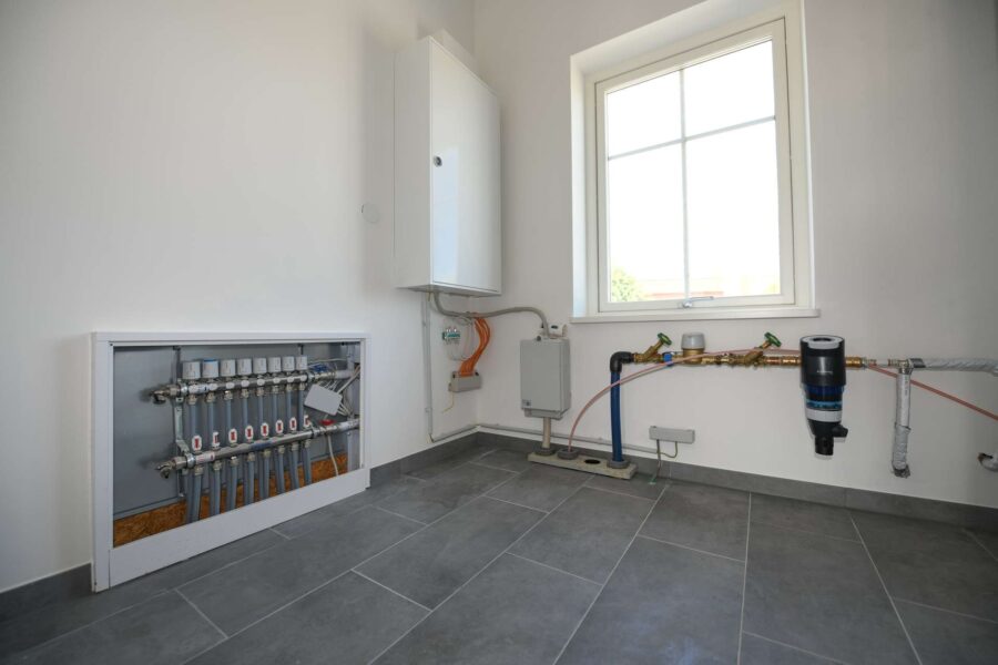 Das Haus entspricht dem Energiestandard Effizienzhaus 55 EE und erreicht die Energieklasse A+. Beheizt wird es über eine moderne Luft-Wasser-Wärmepumpe. Bodentiefe, 3-fach verglaste Fenster sorgen für viel Tageslicht und hervorragende Dämmung.